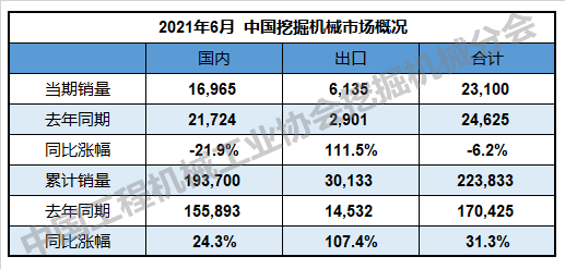 2021年6月,共计销售各类挖掘机械产品23,100台,同比下降6.2%。其中,国内市场销量16,965台,同比下降21.9%;出口销量6,135台,同比涨幅111.5%。